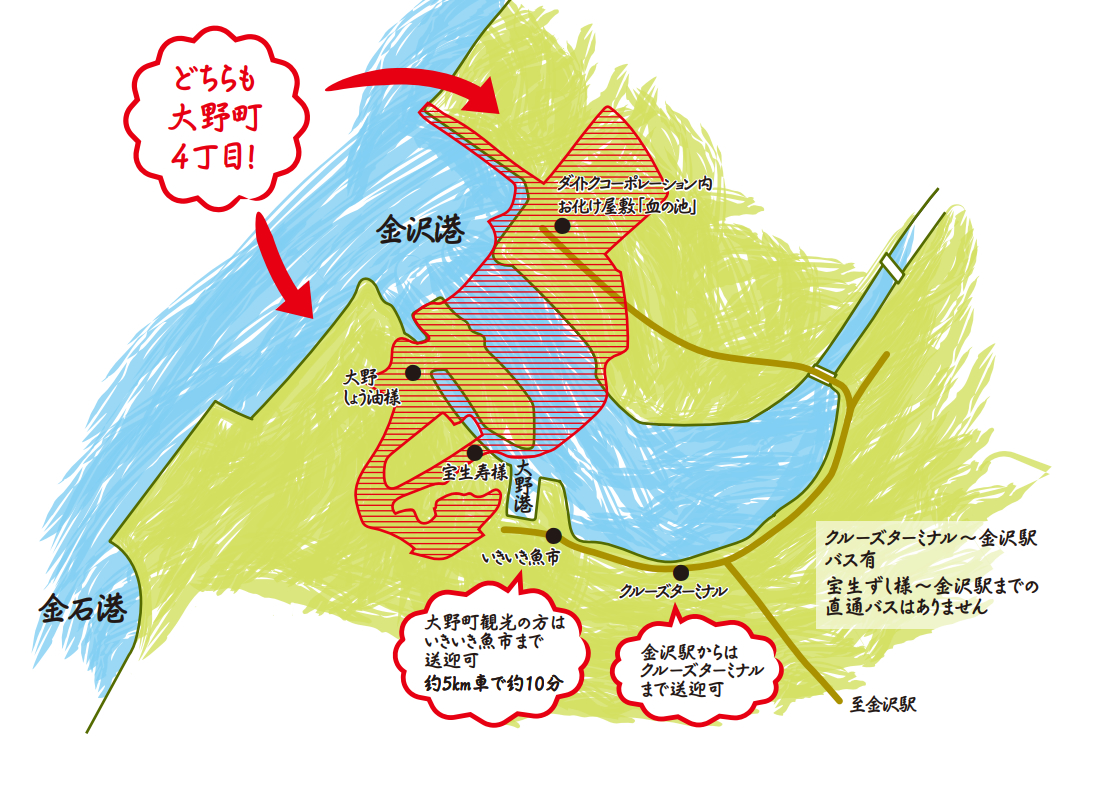 - 弊社は「金沢市大野町4丁目」にございますが、よく観光客が訪れます「金沢市大野町4丁目の地域」とは金沢港を挟み同じ金沢市大野町4丁目ですが区域が違います。歩いてお越し頂くには距離がございますのでお気を付けください。