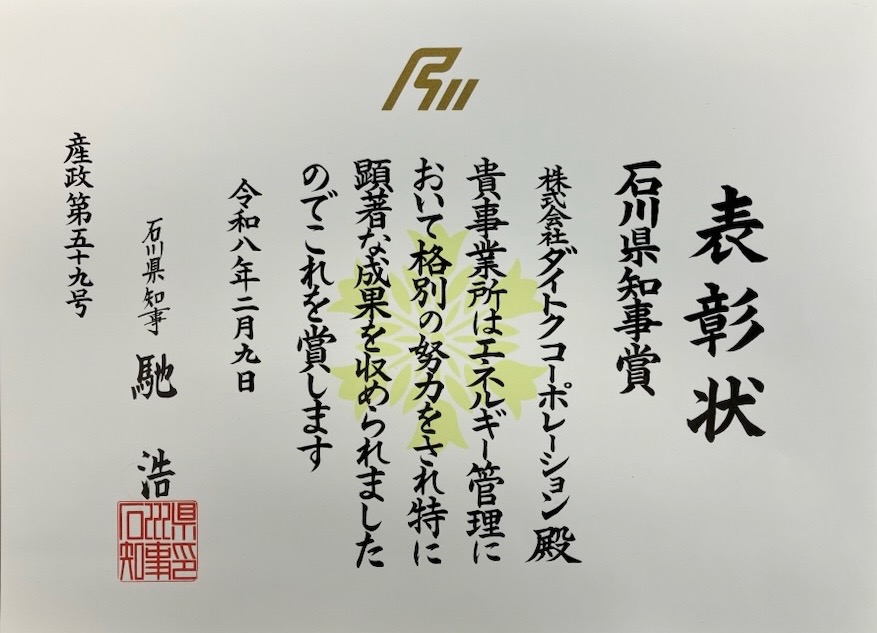 >2025年度エネルギー管理優良事業者として石川県県知事賞の表彰を受けました。
